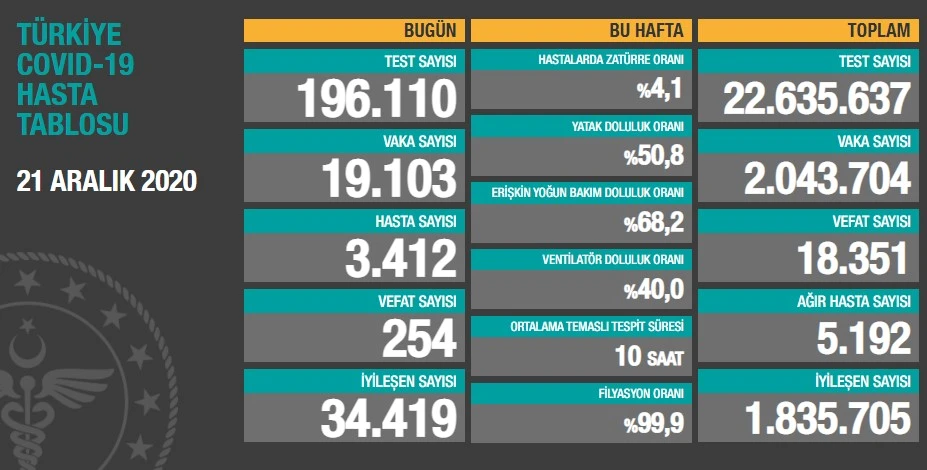 Türkiye'de son 24 saatte 196 bin 110 Kovid-19 testi yapıldı, 19 bin 103 kişinin testi pozitif çıktı, 254 kişi hayatını kaybetti.