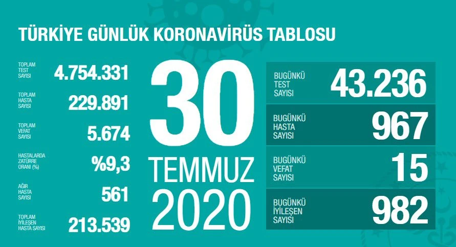 Sağlık Bakanlığının internet sitesinde yer alan ve Bakan Fahrettin Koca'nın da Twitter'dan paylaştığı, "Türkiye Günlük Koronavirüs Tablosu"nun güncel verilerine göre, bugün 43 bin 236 test yapıldı, 967 kişiye Kovid-19 tanısı konuldu. Son 24 saatte 15 hasta vefat etti, 982 kişi iyileşti.