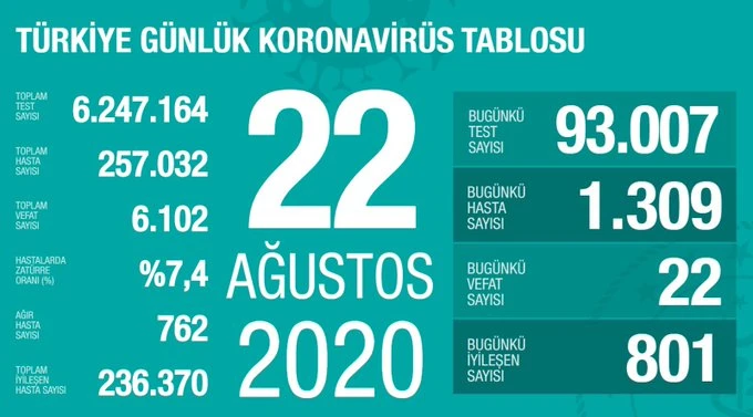 Sağlık Bakanlığının internet sitesinde yer alan, Bakan Fahrettin Koca'nın da Twitter'dan paylaştığı "Türkiye Günlük Koronavirüs Tablosu"nun güncel verilerine göre, bugün 93 bin 7 test yapıldı, 1309 kişide Kovid-19 tespit edildi.