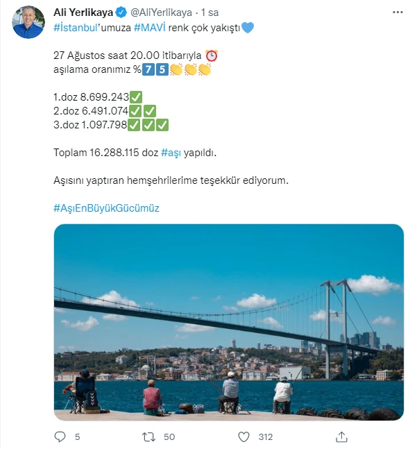 Vali Yerlikaya paylaşımında, "İstanbul’umuza mavi renk çok yakıştı. 27 Ağustos saat 20.00 itibarıyla çalar saat aşılama oranımız yüzde 75. 1. doz 8 milyon 699 bin 243, 2. doz 6 milyon 491 bin 74, 3. doz 1 milyon 97 bin 798, toplam 16 milyon 288 bin 115 doz aşı yapıldı. Aşısını yaptıran hemşehrilerime teşekkür ediyorum" ifadelerini kullandı.