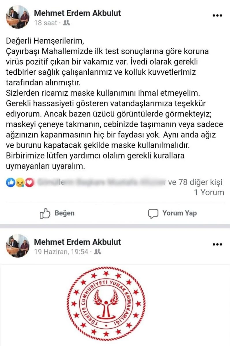 Konuyla ilgili sosyal medya hesabından açıklama yapan Yunak Kaymakamı Mehmet Erdem Akbulut, "Değerli hemşehrilerim, Çayırbaşı Mahallemizde ilk test sonuçlarına göre korona virüs pozitif çıkan bir vakamız var. İvedi olarak gerekli tedbirler sağlık çalışanlarımız ve kolluk kuvvetlerimiz tarafından alınmıştır. Sizlerden ricamız maske kullanımını ihmal etmeyelim. Gerekli hassasiyeti gösteren vatandaşlarımıza teşekkür ediyorum. Ancak bazen üzücü görüntülerde görmekteyiz; maskeyi çeneye takmanın, cebinizde taşımanın veya sadece ağzınızın kapanmasının hiç bir faydası yok. Aynı anda ağız ve burnu kapatacak şekilde maske kullanılmalıdır. Birbirimize lütfen yardımcı olalım gerekli kurallara uymayanları uyaralım" ifadelerini kullandı.