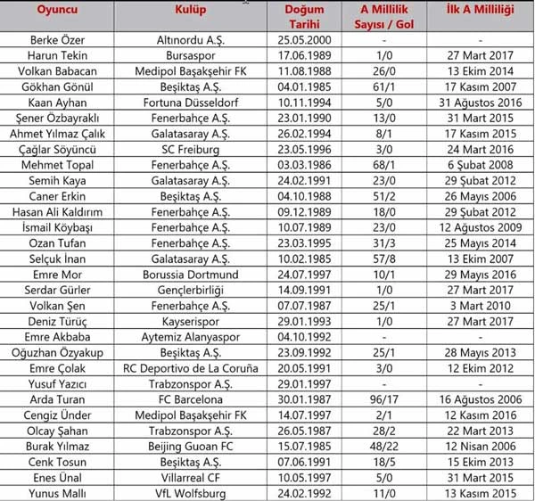 A Milli Takım'ın 5 Haziran'da Üsküp'te Makedonya ile oynayacağı özel maç ile 11 Haziran'da Arnavutluk'un İşkodra kentinde Kosova ile yapacağı 2018 FIFA Dünya Kupası eleme karşılaşmasının aday kadrosu açıklandı.