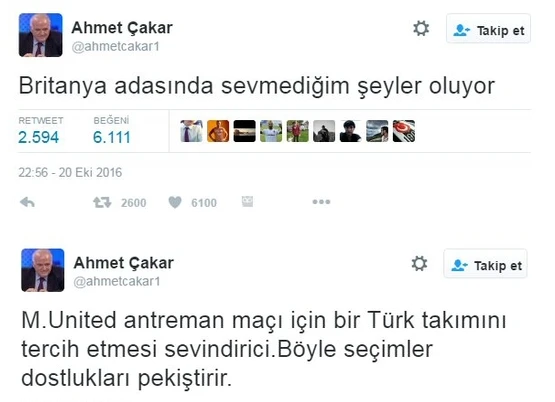Fenerbahçe'nin Manchester United'a karşı farklı şekilde geriye düştüğü bölümde Ahmet Çakar, sosyal medya hesabından "Britanya adasında sevmediğim şeyler oluyor" şeklinde bir paylaşımda bulundu. Maçın bitiminde Fenerbahçe'nin futbolunu eleştiren Ahmet Çakar, "M.United antreman maçı için bir Türk takımını tercih etmesi sevindirici.Böyle seçimler dostlukları pekiştirir." ifadelerini kullandı.