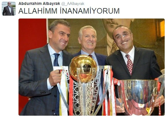 Galatasaray Kulübü eski yöneticilerinden Abdurrahim Albayrak, teknik direktör Hamza Hamzaoğlu ayrılığına şok bir tepki verdi. Sarı-kırmızılı kulüpte bir önceki dönem başkan yardımcılığı görevinde bulunan Albayrak, Twitter hesabından "Allahım inanamıyorum" diye yazdı.