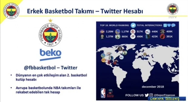 Fenerbahçe, dünyada LA Lakers'tan sonra twitter üzerinde en çok etkileşim alan basketbol takımı konumunda. Burada NBA dışında sadece Fenerbahçe yer alıyor. Bu tablo çok önemli.