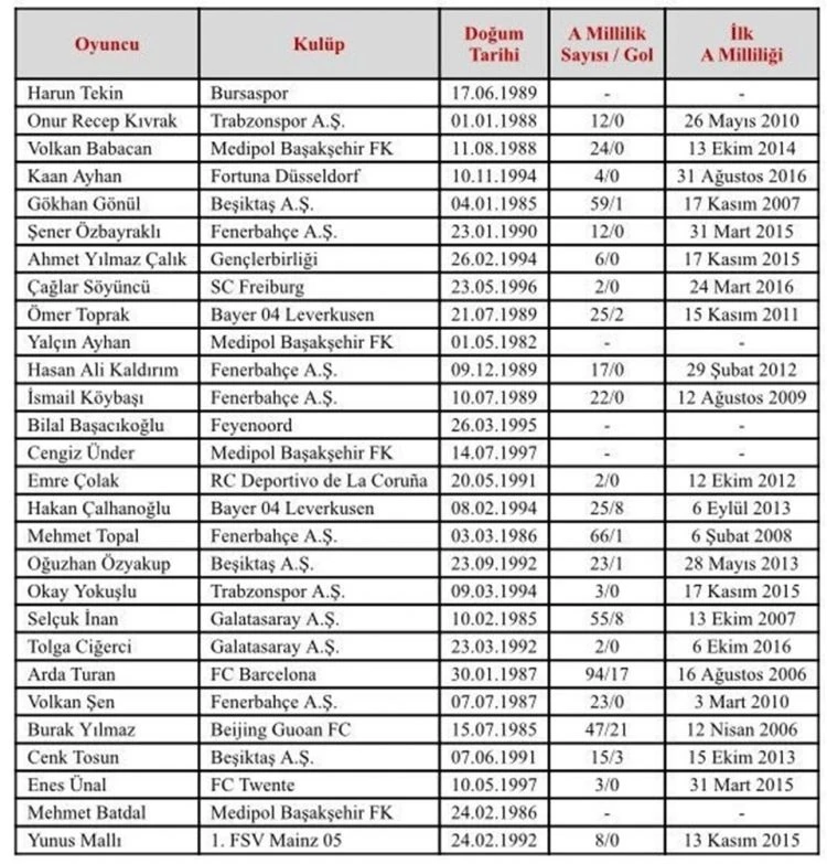 Milli Takım kadrosuna Bursaspor'dan Harun Tekin, Medipol Başakşehir'den Yalçın Ayhan, Cengiz Ünder ve Mehmet Batdal ve Feyenoord'dan Bilal Başacıkoğlu ilk kez çağrıldı.