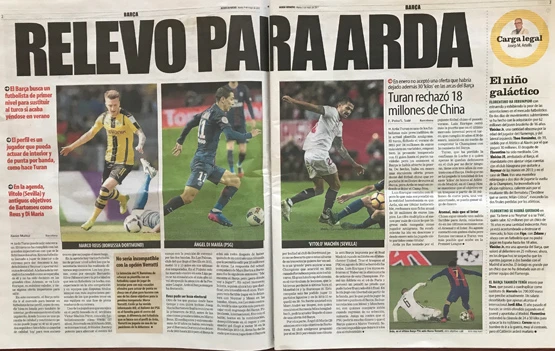 Barcelona Kulübünü yakından takip eden El Mundo Deportivo gazetesi, Arda Turan'ın sezon sonunda takımdan ayrılmasının büyük olasılık olduğunu savunup, Türk futbolcunun yerine düşünülen oyuncularla ilgili iddiasını manşetine çıkardı. "Arda'nın yedek parçaları" başlığı altında verilen haberde, "Barcelona, Türk futbolcuyu en az 25 milyon avroya satmak istiyor. Barça, Arda'nın yerine kaliteli ve çok nitelikli bir orta saha oyuncusu arıyor. İlk adaylar, Paris Saint-Germain'den Angel Di Maria, Borussia Dortmund'dan Reus ve Sevilla'dan Vitolo." ifadeleri kullanıldı.