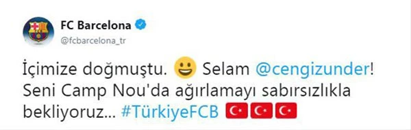 Barcelona'nın Türkçe Twitter hesabı da eşleşme belli olur olmaz, Cengiz ile ilgili bir mesaj yayımladı.