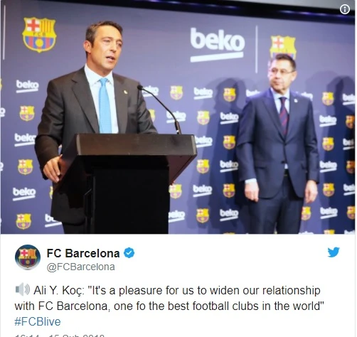 Barcelona, Beko ile olan sponsorluk anlaşmasını 57 milyon avro karşılığında 3 yıl daha uzattı. Anlaşmanın duyurulması için düzenlenen basın toplantısında konuşan Ali Koç, yeniden anlaşmanın memnuniyeti içerisinde olduğunu dile getirdi. Barcelona resmi Twitter hesabı da yaptığı paylaşımlarda Ali Koç'un açıklamalarına yer verdi.