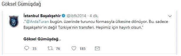 "Arda Turan bugün, üzerinde turuncu formasıyla ülkesine dönüyor. Bu, sadece Başakşehir'in değil Türkiye'nin transferi. Hepimiz için hayırlı olsun."