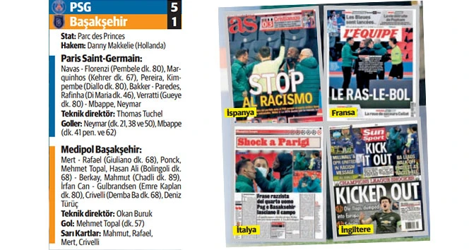 Şampiyonlar Ligi’nde yaşanan tatsız olay dünyada büyük ses getirdi. Başakşehir’in hakemin ırkçı söylemi sonrası soyunma odasına gitmesi sosyal medyada dünya gündeminde bir numara olurken dünya basınına yansımaları da sertti. Bütün gazeteler hakemin ırkçı tavrını eleştirdi ve artık bunun son bulması gerektiği yönünde yorumlarda bulundu. İşte öne çıkan bazı başlıklar: