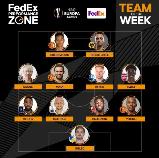 "Belec (Apoel), Young (Manchester United), Gnagnon (Rennes), Trauner (Lask), Clichy (Başakşehir), Saka (Arsenal), Bezus (Gent), Mata (Manchester United), Asano (Partizan), Jota (Wolverhampton), Greenwood (Manchester United)"