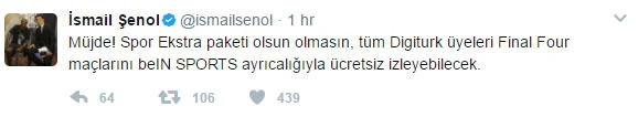 İsmail Şenol, sosyal medya hesabındna yaptığı duyuruda, Spor Paketi olmaksızın tüm Digiturk üyelerinin maçları ücretsiz izleyebileceğini aktardı.
