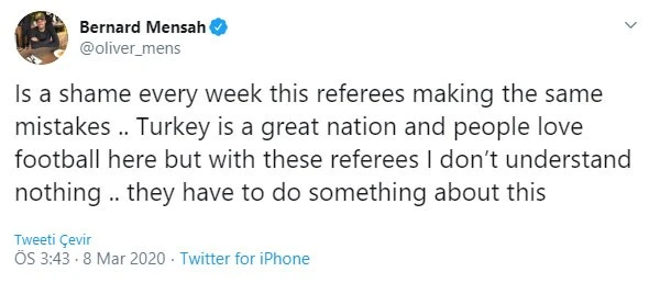 Mensah açıklamasında "Bu hakemler her hafta aynı. Aynı hatalar. Her hafta utanç verici.. Türkiye, büyük bir ulus ve insanlar burada futbolu seviyor. Ama bu hakemlerle hiçbir şey anlamıyorum. Bu konuda bir şeyler yapmak zorundalar" cümleleri paylaştı.