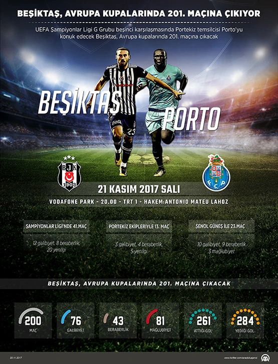 UEFA Şampiyonlar Ligi G Grubu beşinci karşılaşmasında Portekiz temsilcisi Porto'yu konuk edecek Beşiktaş, Avrupa kupalarında 201. maçına çıkacak.