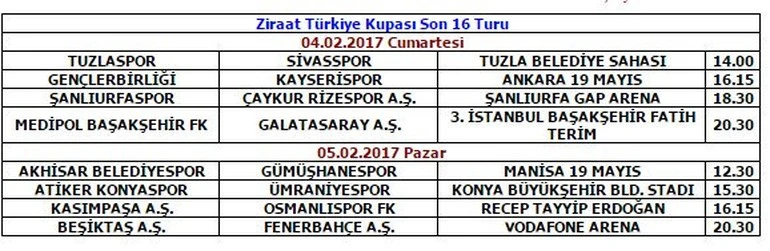 Türkiye Futbol Federasyonu 16 turu maç programını açıkladı. Buna göre Beşiktaş ile Fenerbahçe Vodafone Arena'da 5 Şubat Pazar günü saat 20.30'da karşı karşıya gelecek. Medipol Başakşehir-Galasataray maçı ise Cumartesi günü saat 20.30'da oynanacak.