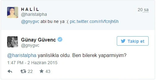 Beşiktaş'ta Tolga Zengin'le Cenk Gönen'in yaşadığı sakatlıklar sonrasında kaleyi devrelan ve sergilediği performansla taraftarların gönlünde yer edinen Günay Güvenç, sosyal medyanın azizliğine uğradı. Galatasaray'ın şampiyonluk kutlaması fotoğrafını beğendiği görülen başarılı file bekçisi, Beşiktaşlı taraftarların tepkisine maruz kaldı. Siyah Beyazlı bir futbolsever, genç kalecinin bu hareketi sonrası "Abi bu ne ya :(" diyerek fotoğrafı neden beğendiğini sordu. Taraftarın sorusuna bekletmeden yanıt veren Günay "Yanlışlıkla oldu. Ben bilerek yapar mıyım?" diyerek takipçisinin gönlüne su serpti.