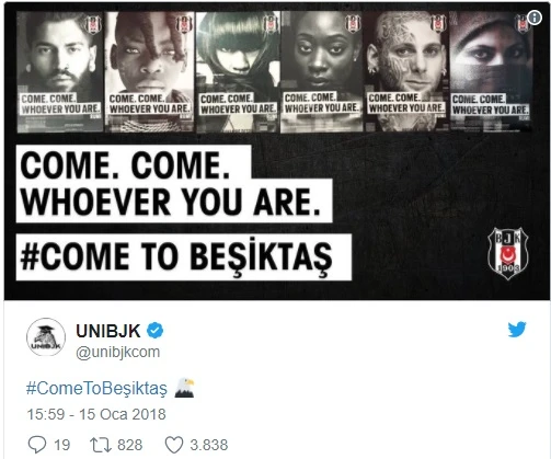 ‘Gel, gel. Ne olursan ol, gel’ başlıklı reklama olumlu tepkiler geliyor. UEFA’nın resmi sosyal medya hesabında da yer verilen kampanyaya, “Beşiktaş’tan harika mesaj, come to Beşiktaş” notu düşüldü. Bu paylaşım, siyah-beyazlı taraftarlardan büyük ilgi gördü.