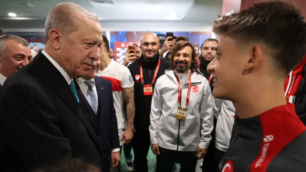 Erdoğan Teknik Direktör Montella, kaptan Hakan Çalhanoğlu, Arda Güler başta olmak üzere milli futbolcuları ve teknik heyeti tebrik etti.