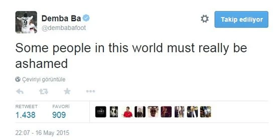 Galatasaray'ın, Spor Toto Süper Lig'in 32. haftasında Gençlerbirliği'ni 1-0 mağlup ettiği mücadelenin ardından Demba Ba'dan kafaları karıştıran bir mesaj geldi. Mücadelenin sona ermesinin ardından mikro blog sitesi Twitter'dan bir paylaşımda bulunan Senegalli oyuncu, "Bu dünyadaki bazı insanlar, gerçekten utanmalı" açıklamasında bulundu. Beşiktaş taraftarları, Demba Ba'nın bu sözlerinin, Galatasaray'ın Sneijder ile bulduğu goldeki hareketleri tartışılan Gençlerbirliği kalecisi Ferhat için söylediğini iddia etti.