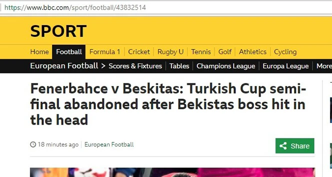 Ziraat Türkiye Kupası Yarı Final rövanş karşılaşmasında yaşanan olaylar Avrupa basınında manşetlere çıktı. Fenerbahçe tribünlerinden atılan cisim nedeniyle Beşiktaş Teknik Direktörü Şenol Güneş'in başından yaralanması, BBC, Bild ve Marca gibi Avrupa'nın önde gelen spor gazetelerinde en üst sıralarda yer aldı. BBC, Şenol Güneş'in başından yaralanarak hastaneye kaldırılmasını manşete çıkarken, Fenerbahçe tribünlerinin attığı yabancı cisimler nedeniyle oyunun sık sık durduğunu da satırlarında belirtti. Almanya'nın en çok okunan gazetesi Bild de Şenol Güneş'in yaralandığı fotoğrafı manşetten verdi. Bild haberi "Beşiktaş Teknik Direktörü başından vuruldu" başlığıyla duyurdu. İspanyol Marca da Beşiktaşlı futbolcu Pepe'nin, Fenerbahçe maçında kırmızı kart gördüğünü belirttiği haberde Fenerbahçe tribünlerinden atılan bir cisim nedeniyle Beşiktaş Teknik Direktörü Şenol Güneş'in hastaneye kaldırılmasıyla maçın tatil edildiğini yazdı.