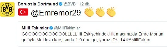 Bundesliga'da Dortmund forması giyen yıldız futbolcu Emre Mor'a kulübünden tebrik mesajı geldi. Dortmund kulübü Türkiye Moldova karşılaşamasında Emre Mor'un golünün ardından 'Milli Takımlar'' adlı A Milli Futbol Takımı'nın resmi twitter adresindeki gol haberini retweet etti.
