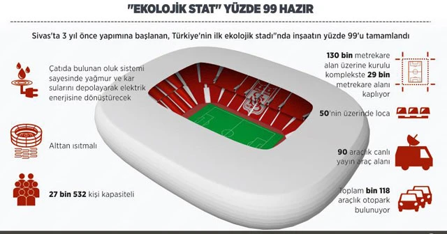 Medicana Sivasspor'un renklerine uygun olarak dizayn edilen kırmızı-beyaz koltukların ve kale direklerinin takılması, çimlerin serilmesi, soyunma odalarının ve yedek kulübelerinin hazırlanmasıyla stat inşaatının yüzde 99'u tamamlandı.