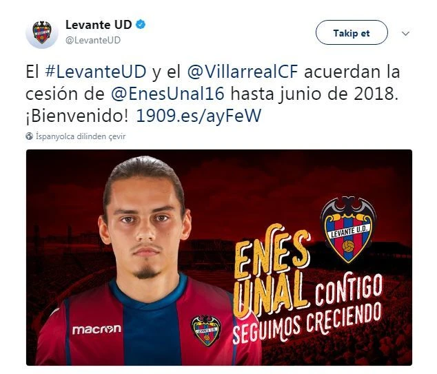 Levante, transferi resmi Twitter hesabından duyururken transfere özel hazırlanan görselde “Seninle birlikte gelişmeye devam edeceğiz” ifadelerine yer verildi.