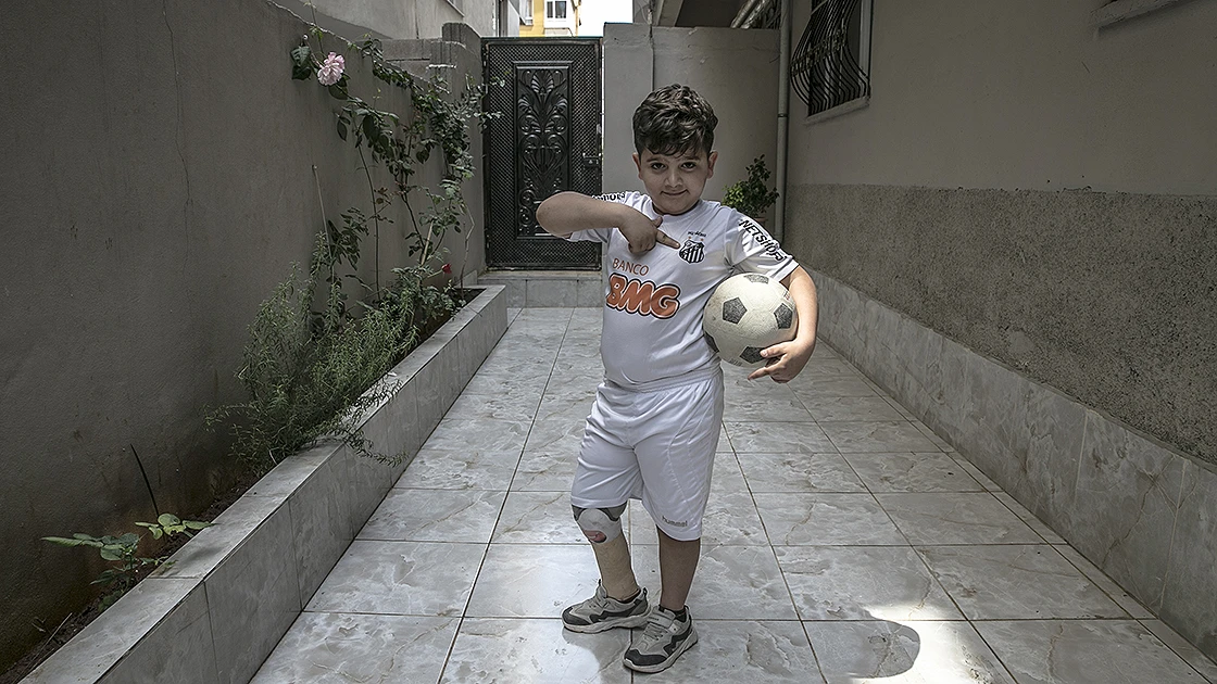 Rejime ait savaş uçakları tarafından yaklaşık 2 yıl önce İdlib kırsalına düzenlenen saldırıda sağ bacağını kaybeden ve tedavisinin yapılabilmesi için babasıyla geldiği Hatay'ın Reyhanlı ilçesinde protez bacağına kavuşan Hamis el Gacir'in futbol sevgisi yüzünü güldürmeye devam ediyor.