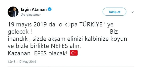 "19 Mayıs 2019'da o kupa Türkiye'ye gelecek" mesajını veren Ataman, "Biz inandık, siz de akşam elinizi kalbinize koyun ve bizimle birlikte NEFES alın. Kazanan EFES olacak" ifadelerini kullandı.