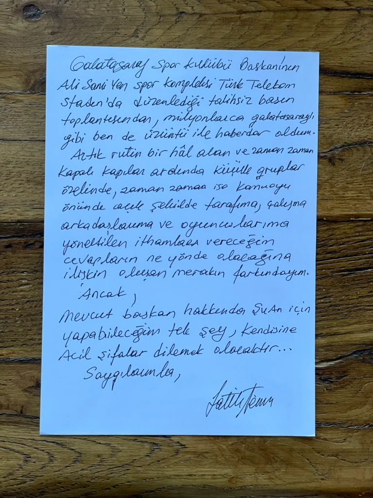 “Galatasaray Spor Kulübü Başkanı’nın Ali Sami Yen Spor Kompleksi Türk Telekom Stadı’nda düzenlediği talihsiz basın toplantısından, milyonlarca Galatasaraylı gibi ben de üzüntü ile haberdar oldum.