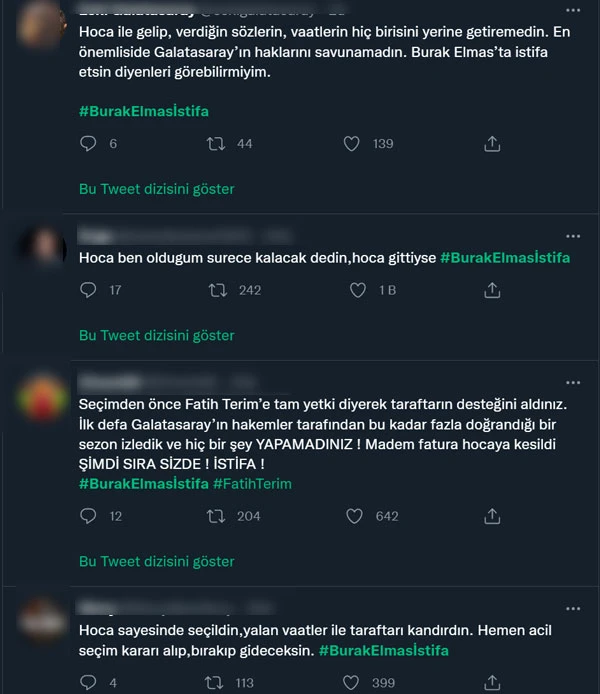 Bugün Terim’in Galatasaray’dan ayrılmasıyla birlikte taraftarların büyük bölümü “#BurakElmasİstifa” etiketine destek vererek sosyal medyayı ayağa kaldırdı. Yarım saat içerisinde binlerce Galatasaraylı, Burak Elmas’ı istifaya çağırdı.