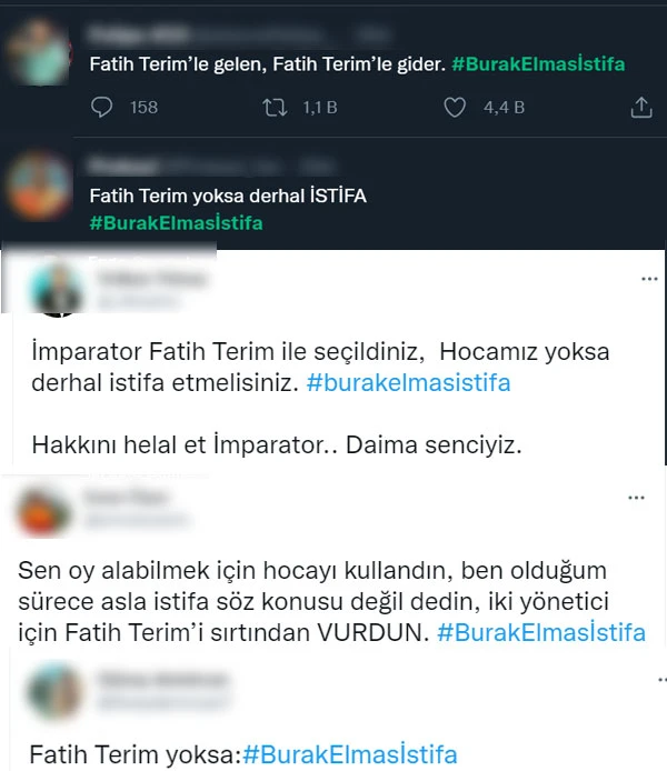 Twitter'da TT olan Burak Elmas'ı istifaya çağıran Galatasaray taraftarları "Fatih Terim'le gelen Fatih Terim'le gider" yorumlarında bulundu.