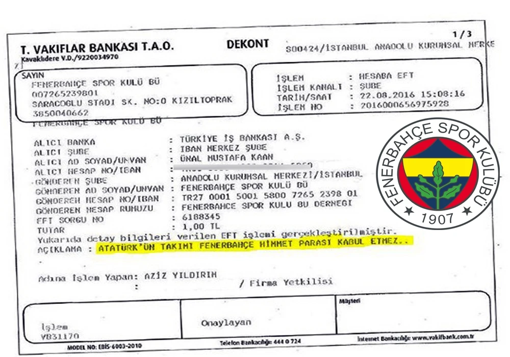 Sarı lacivertli kulüpten yapılan yazılı açıklamada, "Kulübümüzün muhasebe görevlilerinin 22.08.2016 günü rutin çalışmaları sırasında, kulüp hesaplarından birine, Mustafa Kaan Ünal isimli bir şahıstan "FETÖ’cü Fener’e himmet parası” notuyla 1 TL gönderildiği tespit edilmiştir. Konunun fark edilmesi üzerine; bahse konu şahsa, “Atatürk’ün Takımı Fenerbahçe Himmet Parası Kabul Etmez” notuyla aynı meblağ geri gönderilmiştir" denildi.