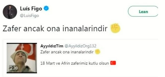 Ünlü Portekizli futbolcu Luis Figo'nun Twitter hesabı hacklendi. Türk askeri ve ÖSO'nun Zeytin Dalı Harekatı'na ilişkin paylaşımlarda bulundu. Afrin'deki zaferi öven tweetler kısa sürede çok sayıda beğeni aldı. Bir dönem Barcelona, Real Madrid, Inter gibi takımların formasını giyen Portekizli eski futbolcu Luis Figo'nun hesabı dün gece Türk hackerlar tarafından hacklendi. Türk askerinin Afrin'deki zaferini öven tweetler atılan hesap, "Zafer ancak ona inanlarındır" dedi. Geçtiğimiz günlerde de eski Bayern Münih ve Real Madrili futbolcu Xabi Alonso'nun hesabı yine Türk hackerlarca hacklenmişti.