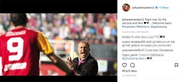 Johan Elmander, Fatih Terim'in Galatasaray'a dönmesi üzerine sosyal medya hesabından " Görev için kulüp için ve taraftarlar için doğru adam. Hoş geldin" ifadelerini kullandı.