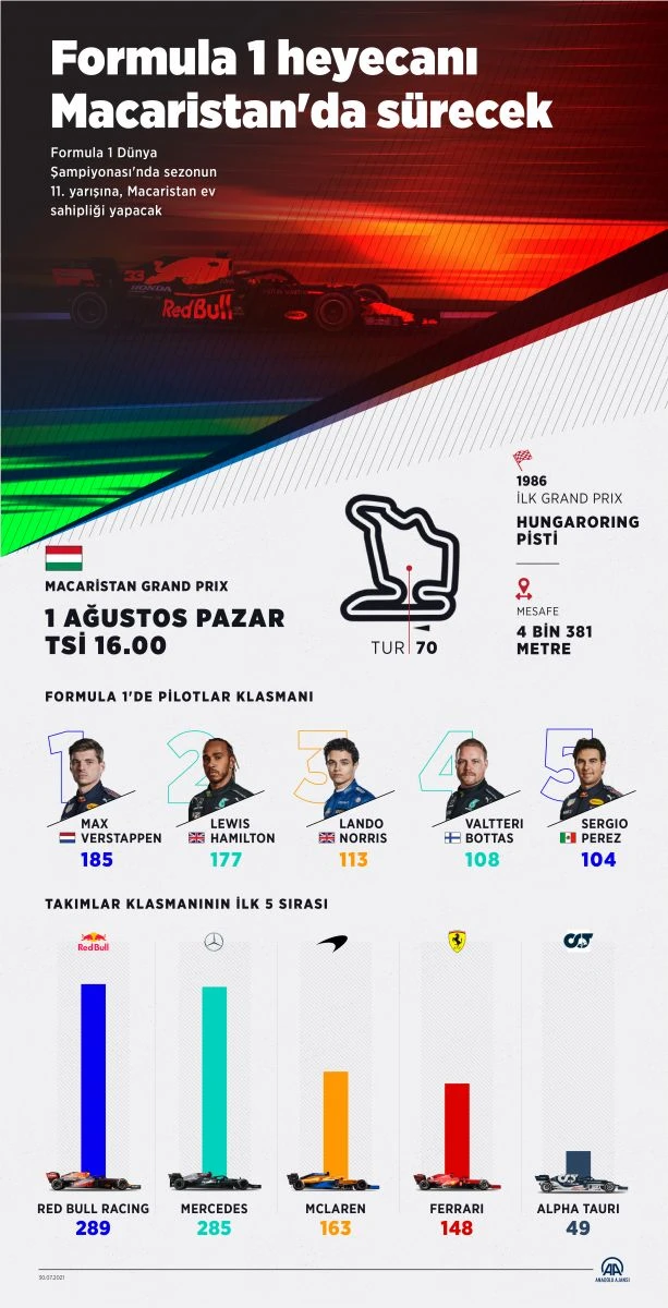 Formula 1'de şampiyonanın 11. ayağı, başkent Budapeşte'deki 4,3 kilometrelik Hungaroring Pisti'nde düzenlenecek. Macaristan Grand Prix'sinin sıralama turları, yarın TSİ 16.00'da başlayacak. 70 turluk yarış ise 1 Ağustos Pazar günü aynı saatte gerçekleştirilecek.