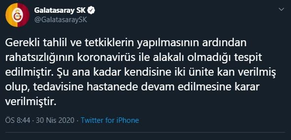 Halsizlik ve yorgunluk şikayetiyle hastaneye götürülen Mustafa Cengiz'e ilk olarak koronavirüs testi yapıldı. Testin sonucu negatif çıkan başkan Cengiz'e 2 ünite kan verildi. Cengiz'in,doktorların gözetimi altında tutulacağı öğrenildi.