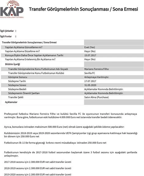 KAP'a yapılan açıklamada, sarı-kırmızılıların Mariano için Sevilla'ya 4 milyon Euro bonservis ve performansa göre 500 bin Euro ödeyeceği belirtildi. Ayrıca Brezilyalı futbolcu 3 yıllık sözleşme süresince sarı-kırmızılılardan yılda 2 milyon 300 bin Euro garanti ücret alacak.