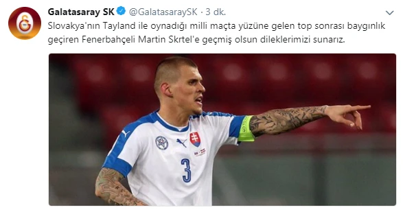 Sarı-kırmızılı kulübün internet sitesinde yer alan mesajda, "Slovakya'nın Tayland ile oynadığı milli maçta yüzüne gelen top sonrası baygınlık geçiren Fenerbahçeli Martin Skrtel'e geçmiş olsun dileklerimizi sunarız." ifadeleri kullanıldı.