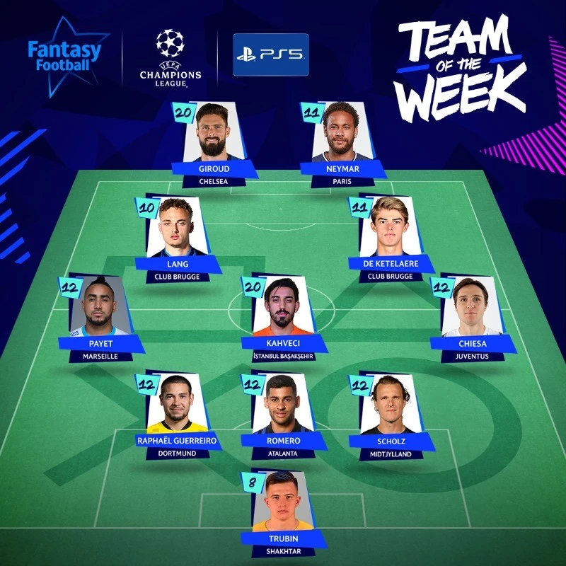 "Trubin (Shakhtar), Scholz (Midtjylland), Romero (Atalanta), Raphael Guerreiro (Dortmund), İrfan Can Kahveci (Başakşehir), Chiesa (Juventus), Payet (Marsilya), Lang (Club Brugge) De Ketelaere, (Club Brugge), Neymar (PSG), Giroud (Chelsea)"