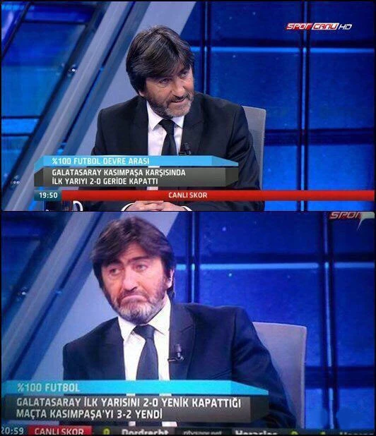 NTVSpor’da yayınlanan Yüzde 100 futbol programında Galatasaray-Kasımpaşa maçını yorumlayan ve maç keyif veriyor diyen Rıdvan Dilmen ilk yarı Kasımpaşa’nın 2-0 üstünlüğüyle tamamlanınca keyifli olduğu görülüyor. Dilmen’in Maç sonunda Galatasaray’ın 3-2 yenmesiyle oldukça değiştiği ve yüzünün asık olduğu görülüyor.