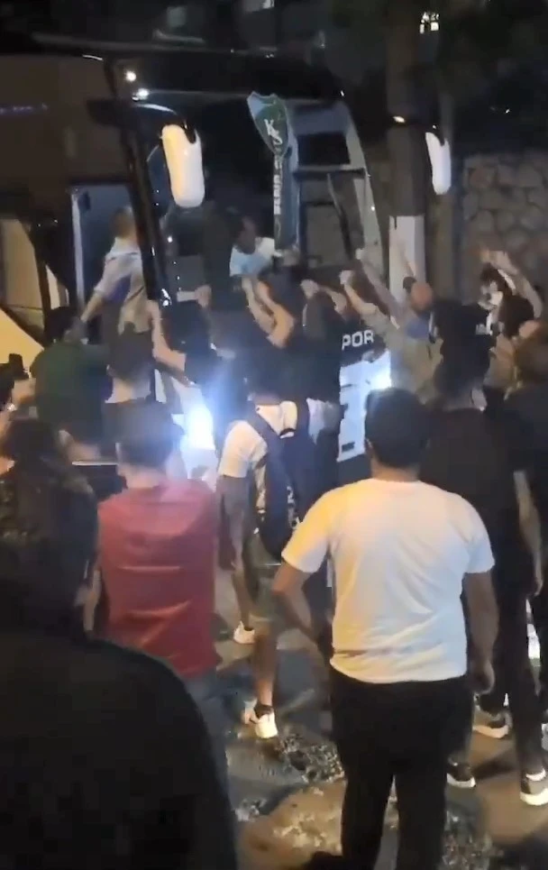 Takım otobüsünün önüne geçen futbolseverler, futbolcular ve teknik heyete tepki göstererek, "Futbolcu mu dövelim?" diye sloganla attı.