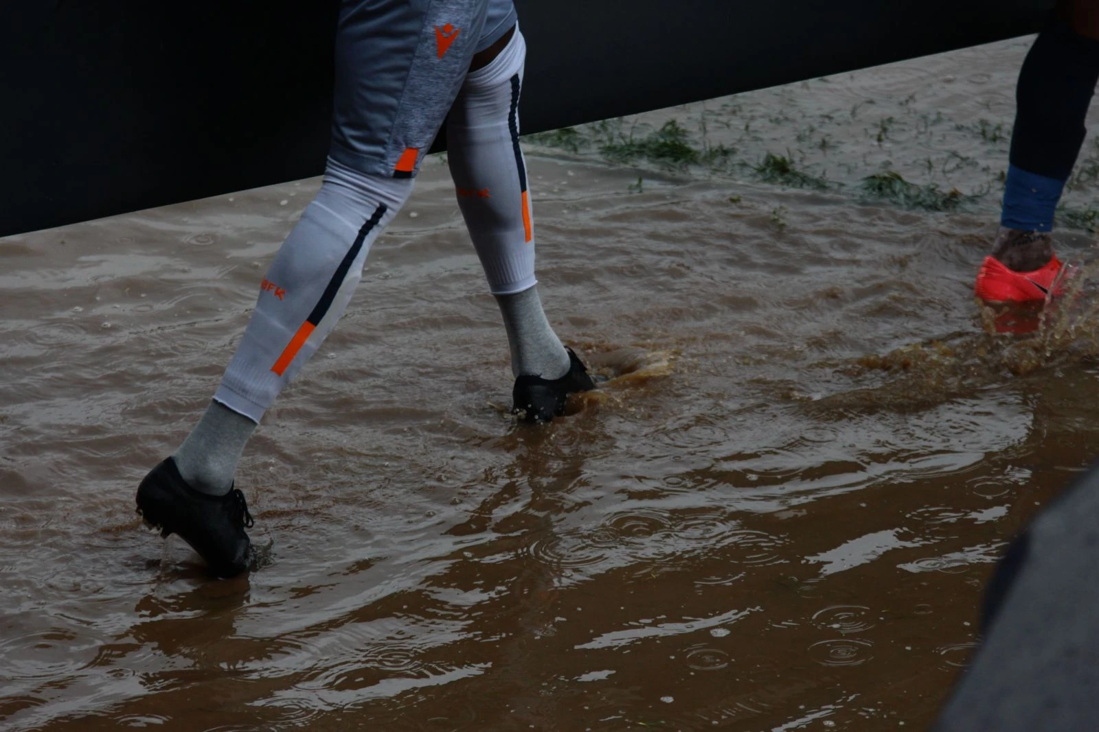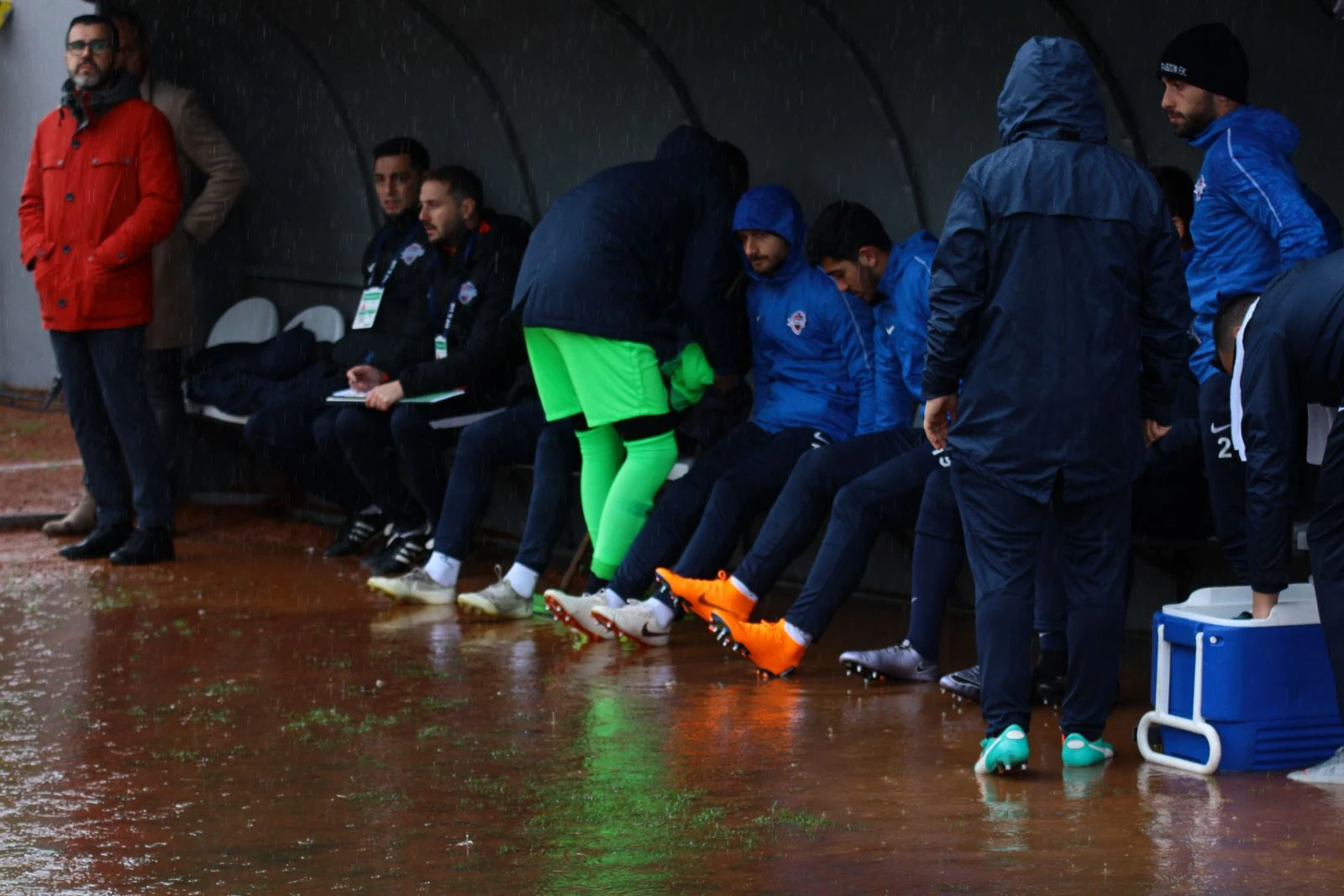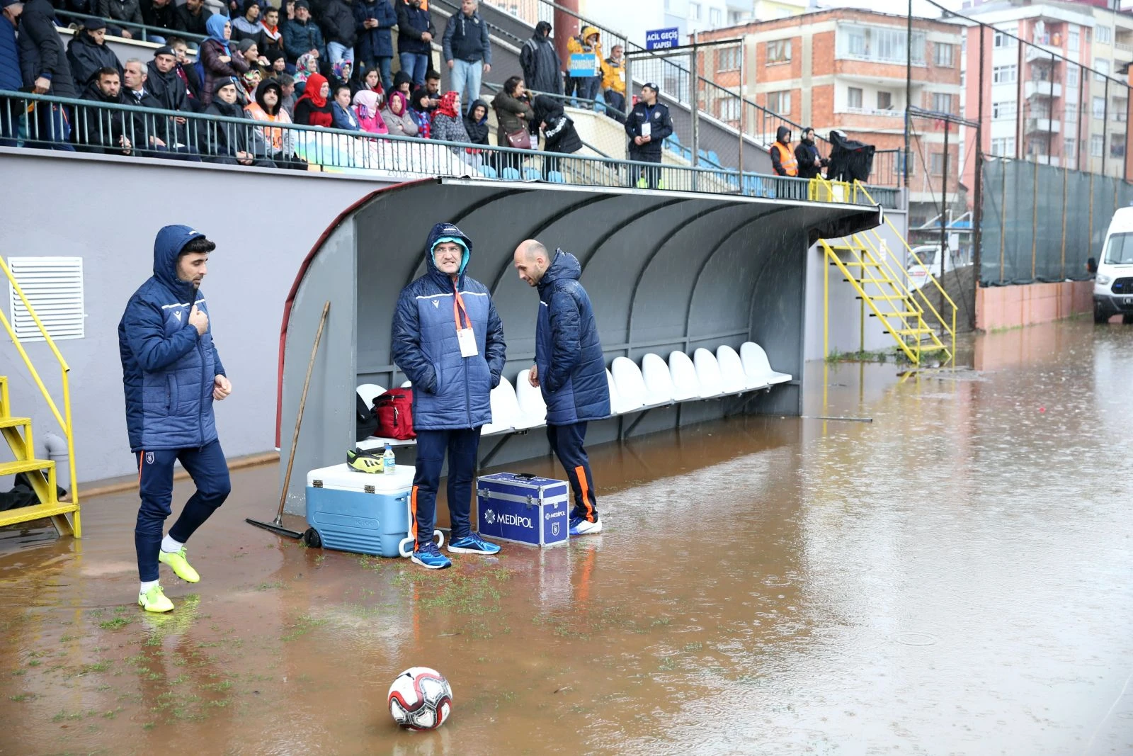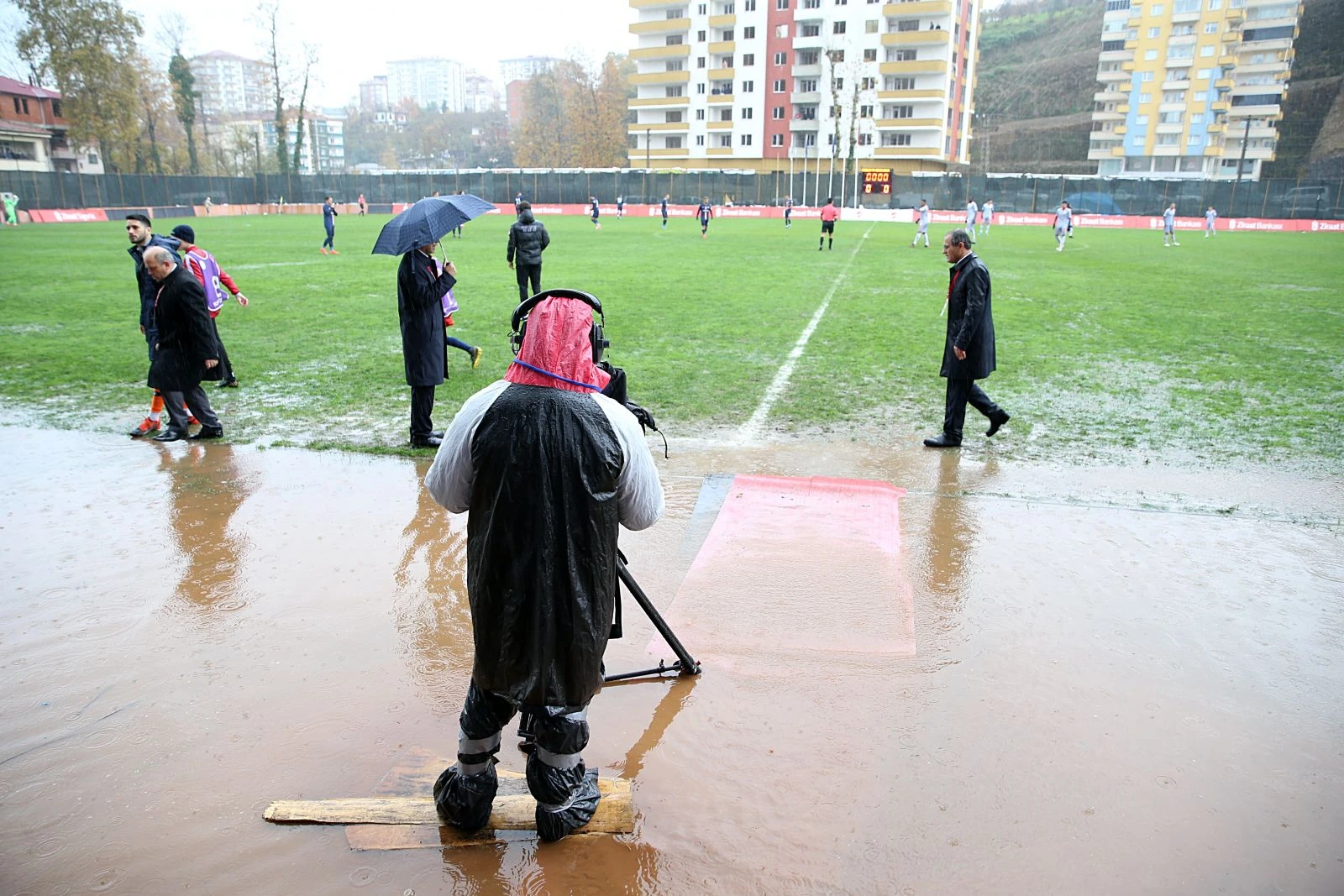 Trabzon VakfıKebir İlçe Stadı'nda oynanan mücadele öncesinde yağan yoğun yağmur, ilginç görüntülerin çıkmasına neden oldu. Yağmur nedeniyle stadın birçok bölgesi sular altında kalırken, yedek kulübesinin olduğu bölgeyi su altında kaldı.