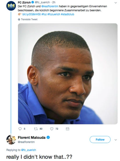 Kulübün Twitter hesabından yapılan açıklamada, "Zürih ile Florent Malouda arasındaki iş birliği karşılıklı anlaşmayla sona ermiştir." denildi. Paylaşımı Twitter üzerinden yanıtlayan Malouda, "Gerçekten mi? Bundan haberim yoktu." ifadesini kullandı.