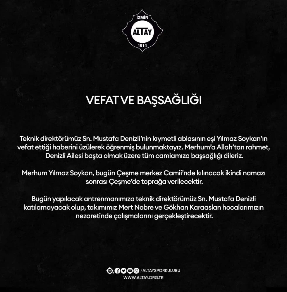 Süper Lig ekiplerinden Altay’ın Teknik Direktörü Mustafa Denizli’nin ablasının eşi Yılmaz Soykan vefat etti. Yılmaz Soykan, bugün ikindi namazını müteakip Çeşme Merkez Camii’nde kılınan namazın ardından toprağa verildi.