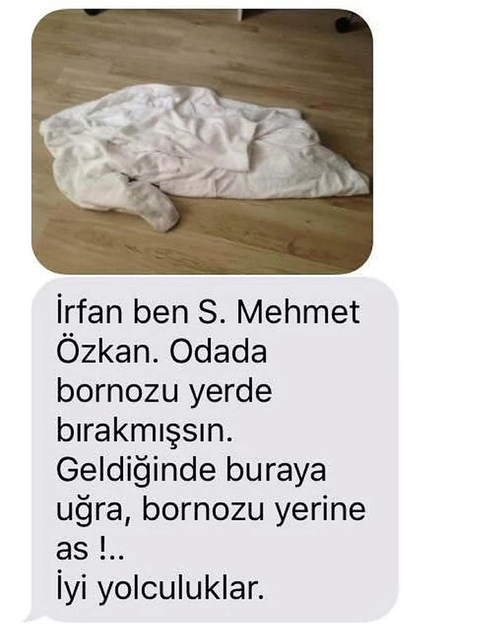 Bu arada tesisi gezerken İrfan'ın duştan sonra kullandığı bornozu yerde gören Başkan Seyit Mehmet Özkan, duruma tepki gösterip tecrübeli futbolcunun cep telefonuna, "İrfan, ben Seyit Mehmet Özkan. Odada bornozu yerde bırakmışsın. Geldiğinde buraya uğra, bornozu yerine as" şeklinde mesaj gönderdi.