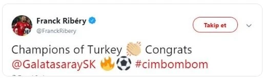 Galatasaray, Akhisarspor'u 3-1 yenerek kupayı müzesine götürürken tebrik yağmuruna tutuldu. Kupayı kazanan sarı-kırmızılılara birçok tebrik mesajı gelirken onlardan biri de Bayern Münih'in yıldız ismi Franck Ribery oldu.