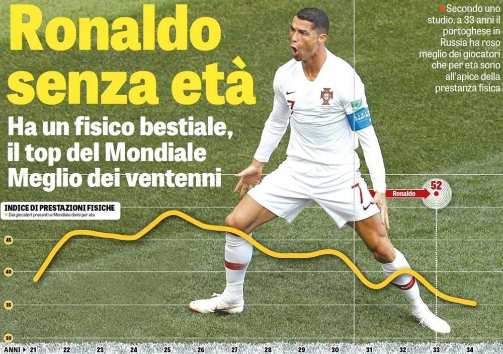 Çizme basınının önemli kuruluşlarından olan La Gazzetta dello Sport’ta yer alan habere göre; 33 yaşındaki Cristiano Ronaldo’nun biyolojik olarak 20 yaşındaki bir futbolcuyla benzer özellikleri taşıdığı saptandı. Yıldız oyuncunun performans verileri de 20 yaşındaki futbolcularla benzerlik gösterdi. Ortalama bir futbolcunun vücudundaki yağ oranı %10-11, kas kütlesi %46 iken Ronaldo'nun ise %7 ve %50 olarak belirlendi. 33 yaşındaki yıldızın bu veriler ışığında 40 yaşına kadar üst düzey kulüplerde futbol oynayabileceği tahmin ediliyor.