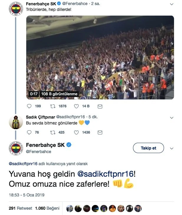 Fenerbahçe de Sadık Çiftpınar'a cevaben "Yuvana hoş geldin Sadık Çiftpınar! Omuz omuza nice zaferlere" dedi.
